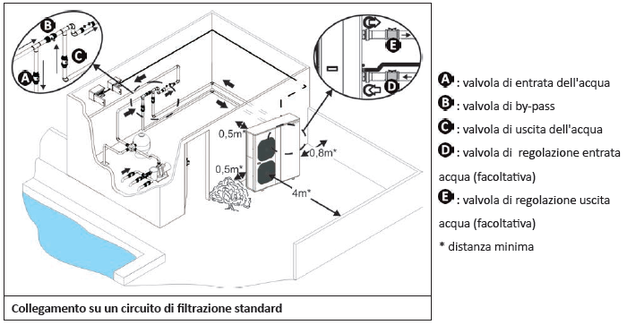 Il collegamento sarà realizzato con un tubo in PVC ø63, utilizzando i raccordi forniti, sul circuito di filtrazione della piscina, dopo il filtro e prima del trattamento dell'acqua